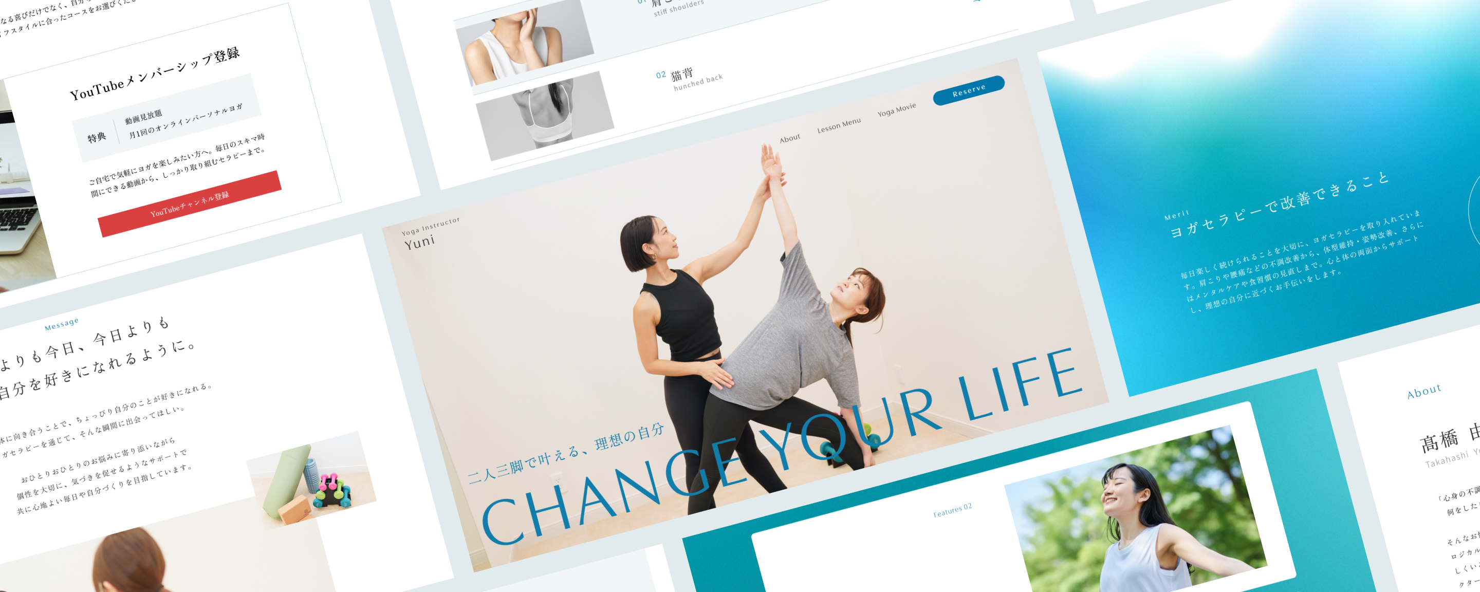 - デザインコンセプトは「癒しの海辺」。 ゆったりとした雰囲気の中でパーソナルヨガを楽しんでいただけるという印象にするために お客様に寄り添うような写真を配置。穏やかな海のグラデーションや余白を取り入れ、安心感や安らぎ感を表現しました。 日常に寄り添いながら、続けられる心地よさと前向きな気持ちを後押しするような世界観を目指しました。