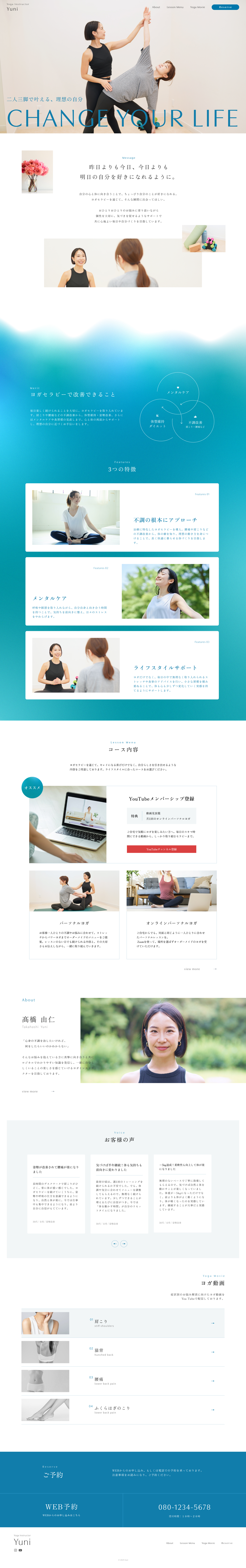 - ヨガ未経験者にも安心して関心を持ってもらえるよう、 「認知 → 共感 → 信頼 → 行動」の流れで構成。 FVでは伴走型のインストラクター像を印象づける写真と「二人三脚で叶える理想の自分」というコピーで信頼に。 続くセクションでヨガセラピーの魅力やコース、講師紹介を通して人柄や専門性を伝え、 体験者の声で共感と安心感を補強。最後にYouTube動画を配置し、継続への導線を設計しました。